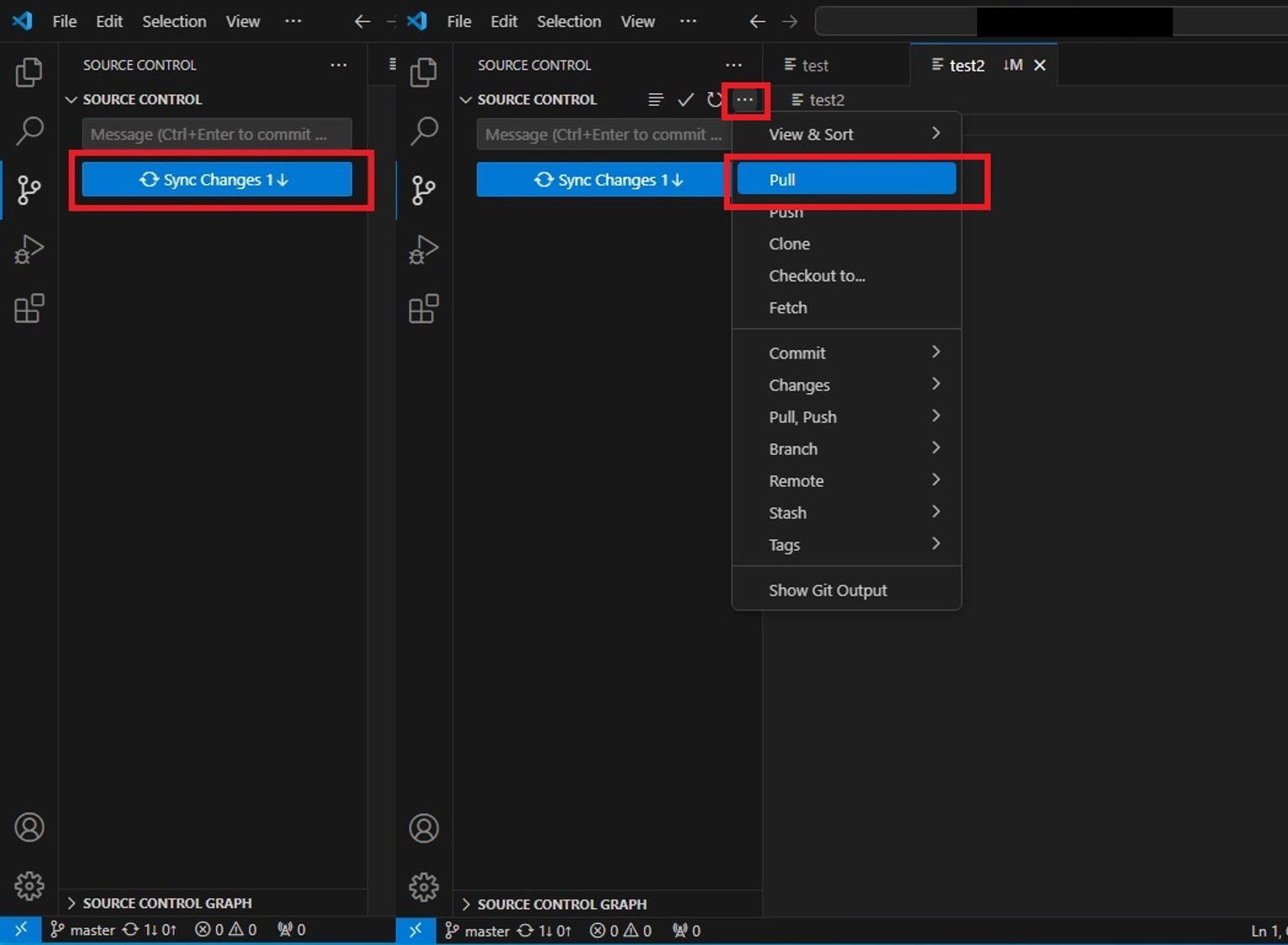 ● SOURCE CONTROL 옆 [...] 버튼 클릭 후 [pull]을 누르면 pull 이 진행됨